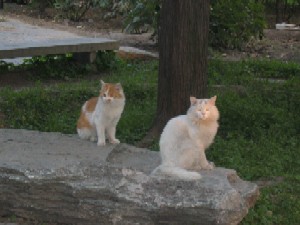 5−6匹の丸々したネコたち。エサをもって中国人のおばさんがきていました。」