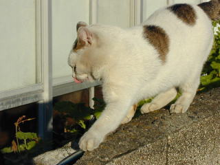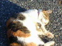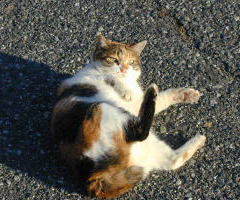 この三毛は首輪をしていて、飼い猫のようだ。