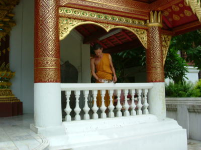 お坊さんは、三毛の子猫を抱き上げてお堂の正面側に連れてくると、そこでなではじめました。
